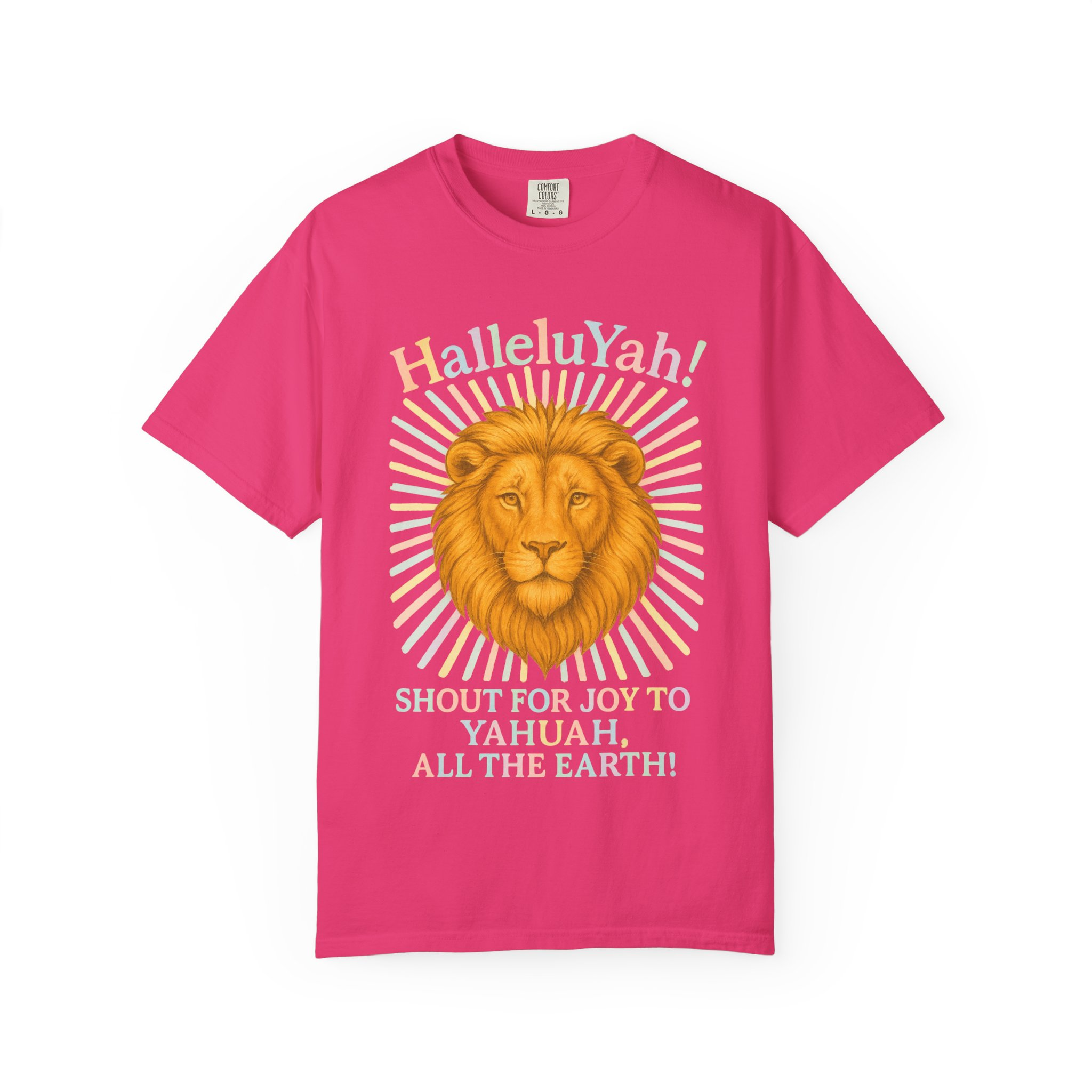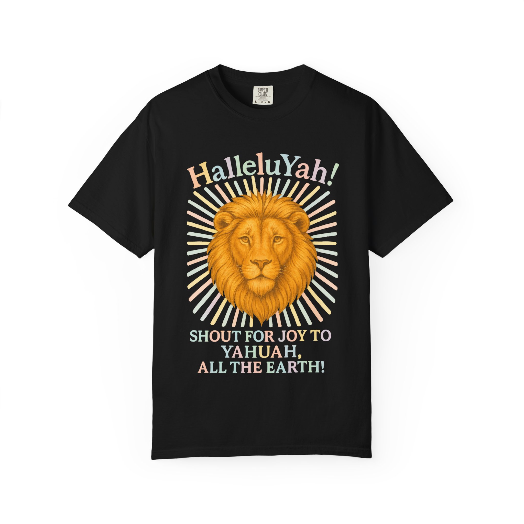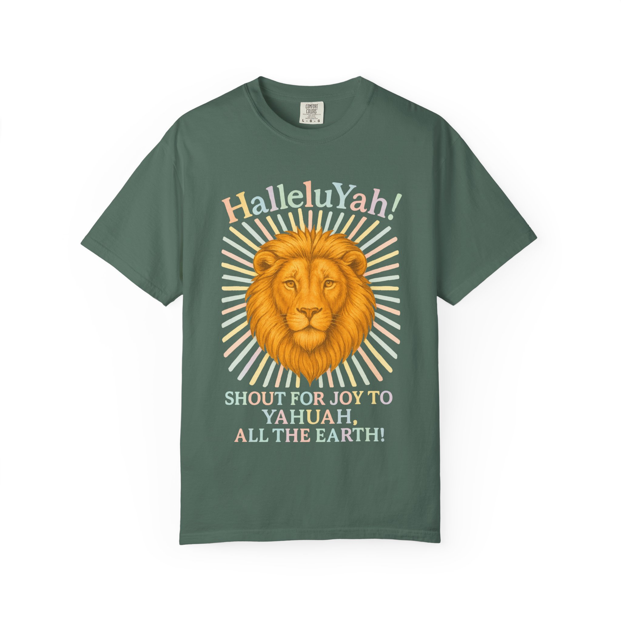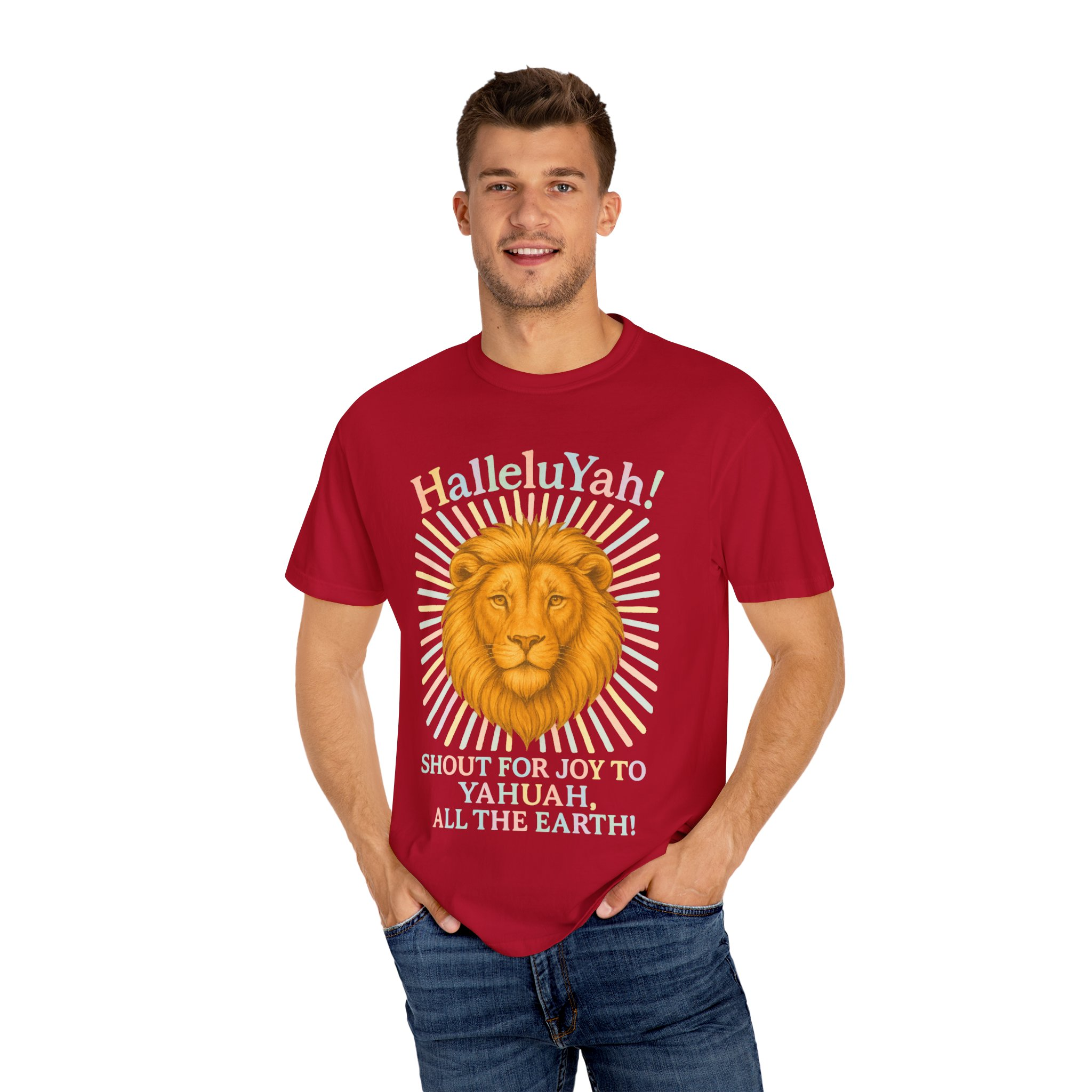 This unisex garment-dyed T-shirt features the quote “HalleluYah ” “Shout for joy to Yahuah all the Earth” with a radiant lions head. The design gives a powerful and spiritual vibe, perfect for those who appreciate meaningful messages on their clothing. This T-shirt is relevant for religious holidays and celebrations, and is targeted towards individuals who value faith and positivity in their lives.