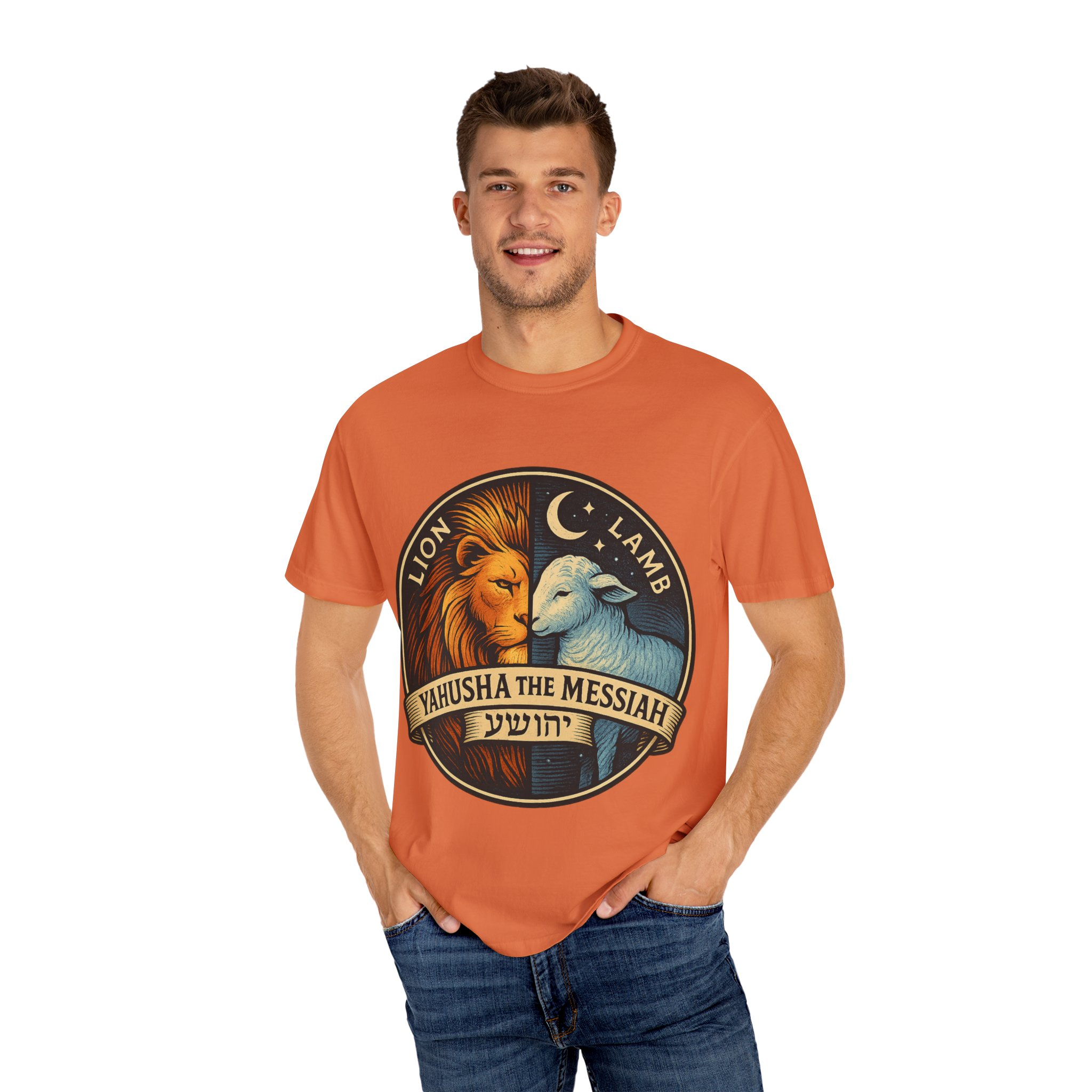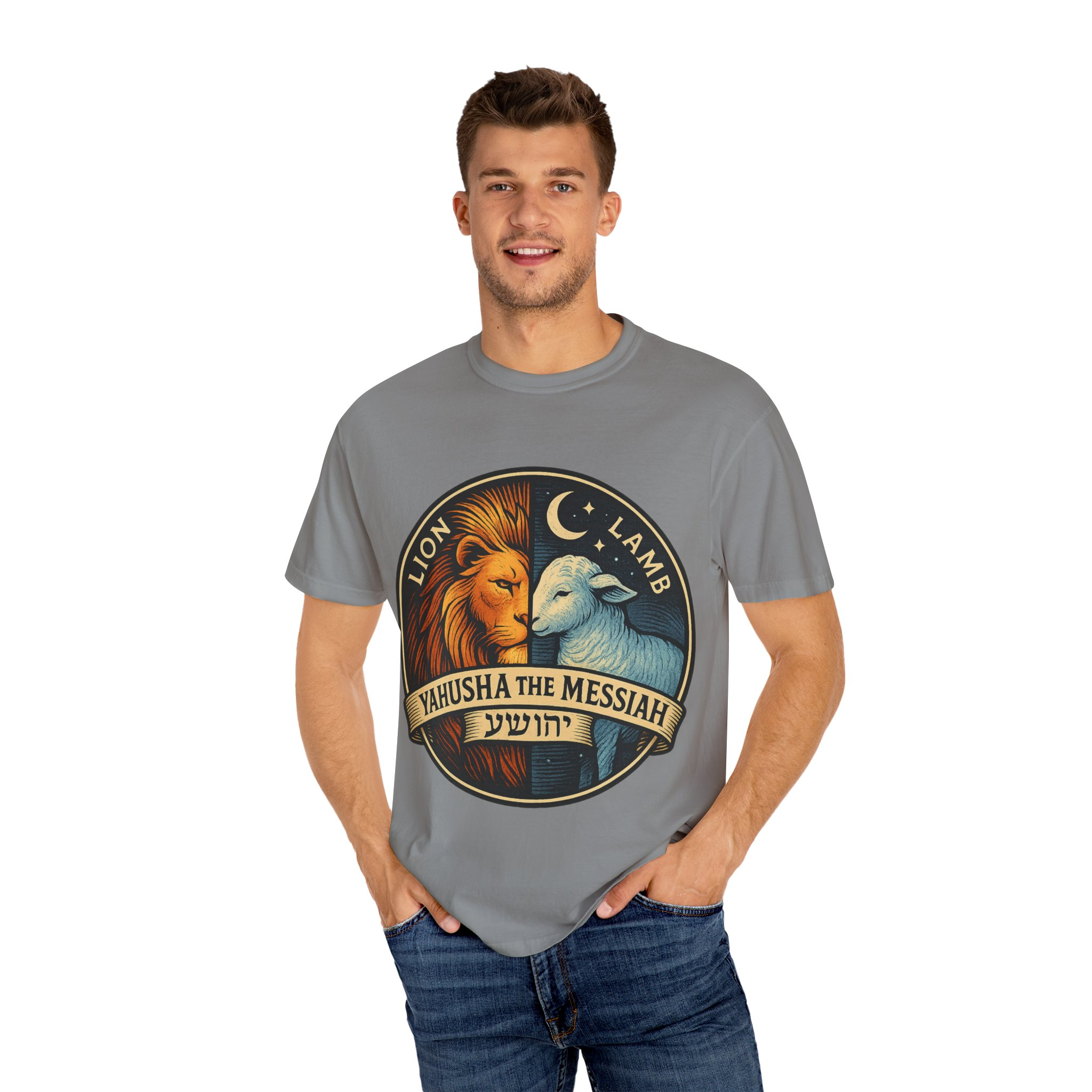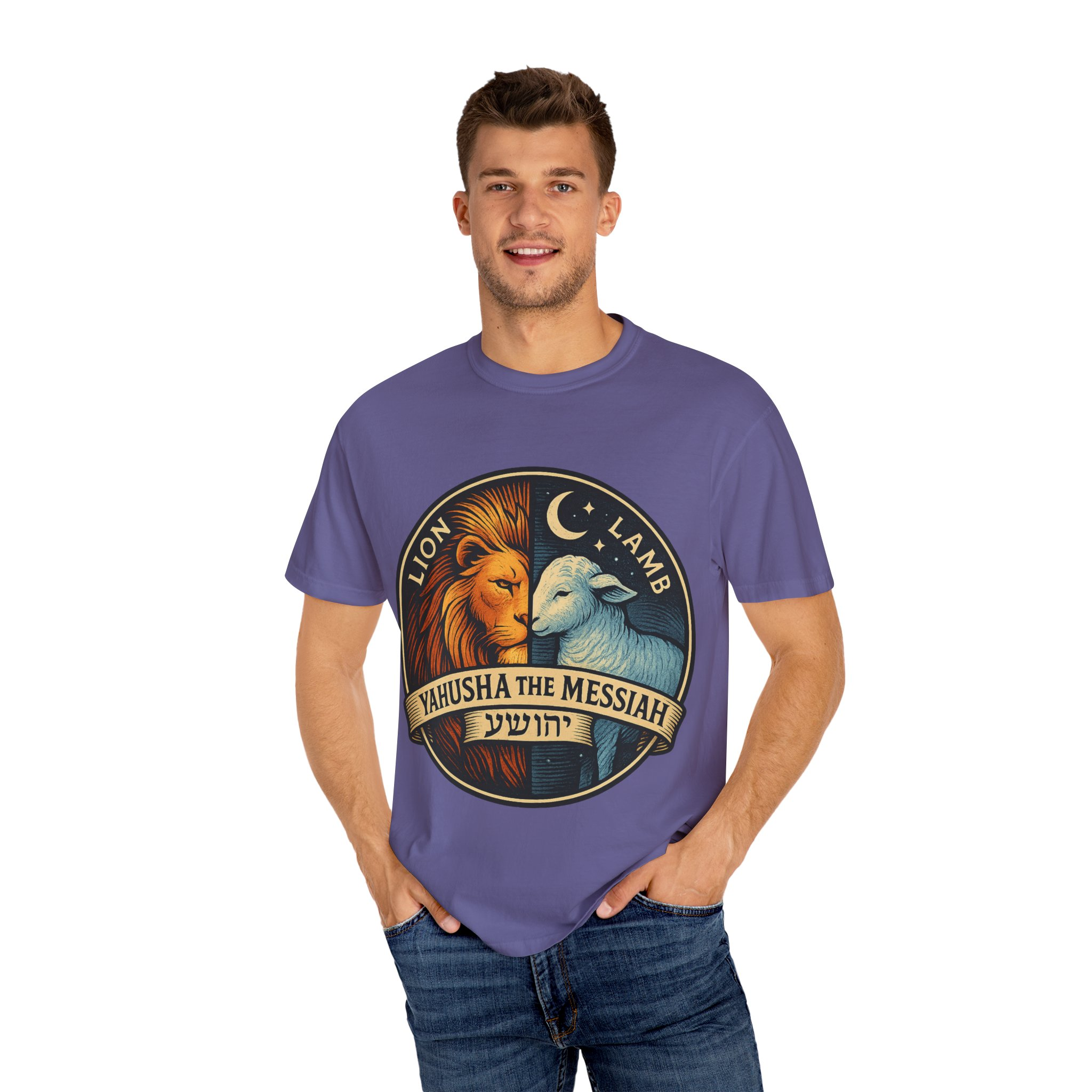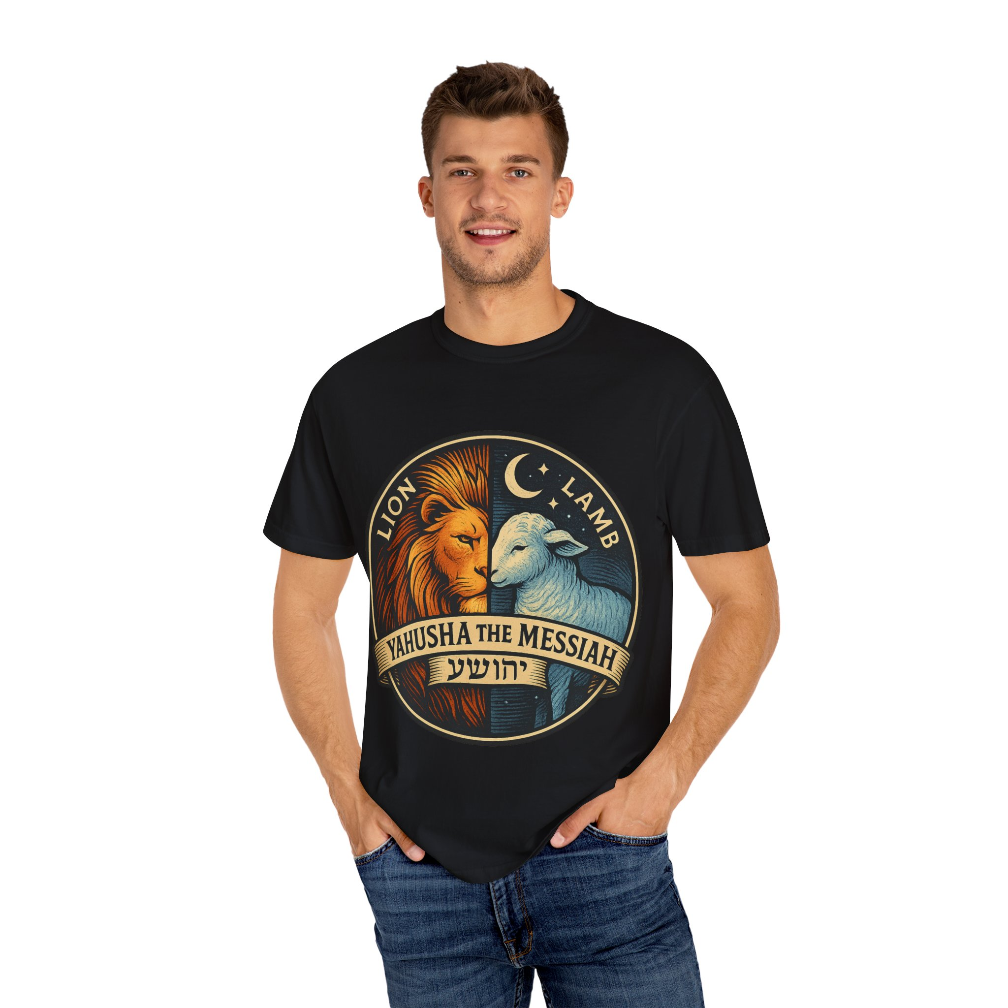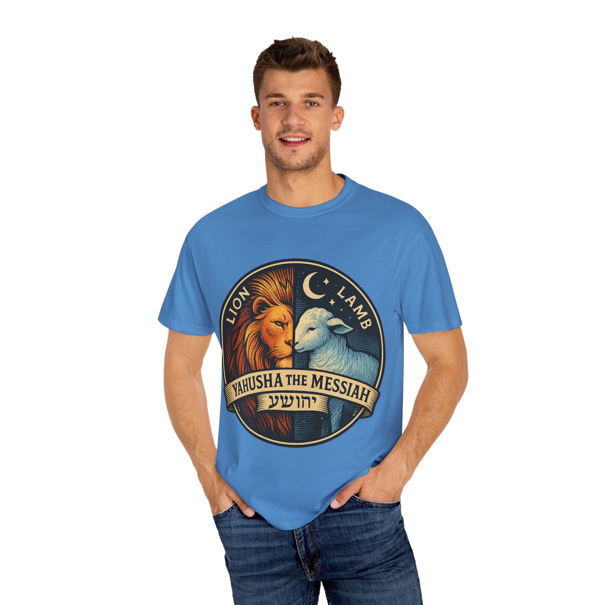 This bold emblem captures the dual nature of Yahusha the Messiah—the conquering Lion and the gentle Lamb. The circular design is split vertically: one side features a regal lion with a blazing sunburst mane, while the other shows a peaceful lamb under a serene night sky. In the center, a banner reads “Yahusha the Messiah”, with the sacred Hebrew name יהושע beneath. Fiery oranges and cool blues create a dramatic contrast symbolizing justice and mercy, strength and humility. A perfect design for believers who walk in both truth and grace. Embrace comfort and style with this unisex garment-dyed t-shirt. Crafted for both casual and semi-formal settings, it features a relaxed fit that suits various body types and a classic crew neckline perfect for layering or accessorizing. This versatile tee evokes a laid-back atmosphere, making it ideal for everyday wear or special occasions. Celebrate your faith and express your individuality, whether it’s for a gathering, a holiday celebration, or just a cozy day at home. Perfect for anyone who values comfort and authenticity in their clothing choices, it’s a thoughtful gift for friends and family during holidays like Christmas or Easter, or as a personal treat for yourself.