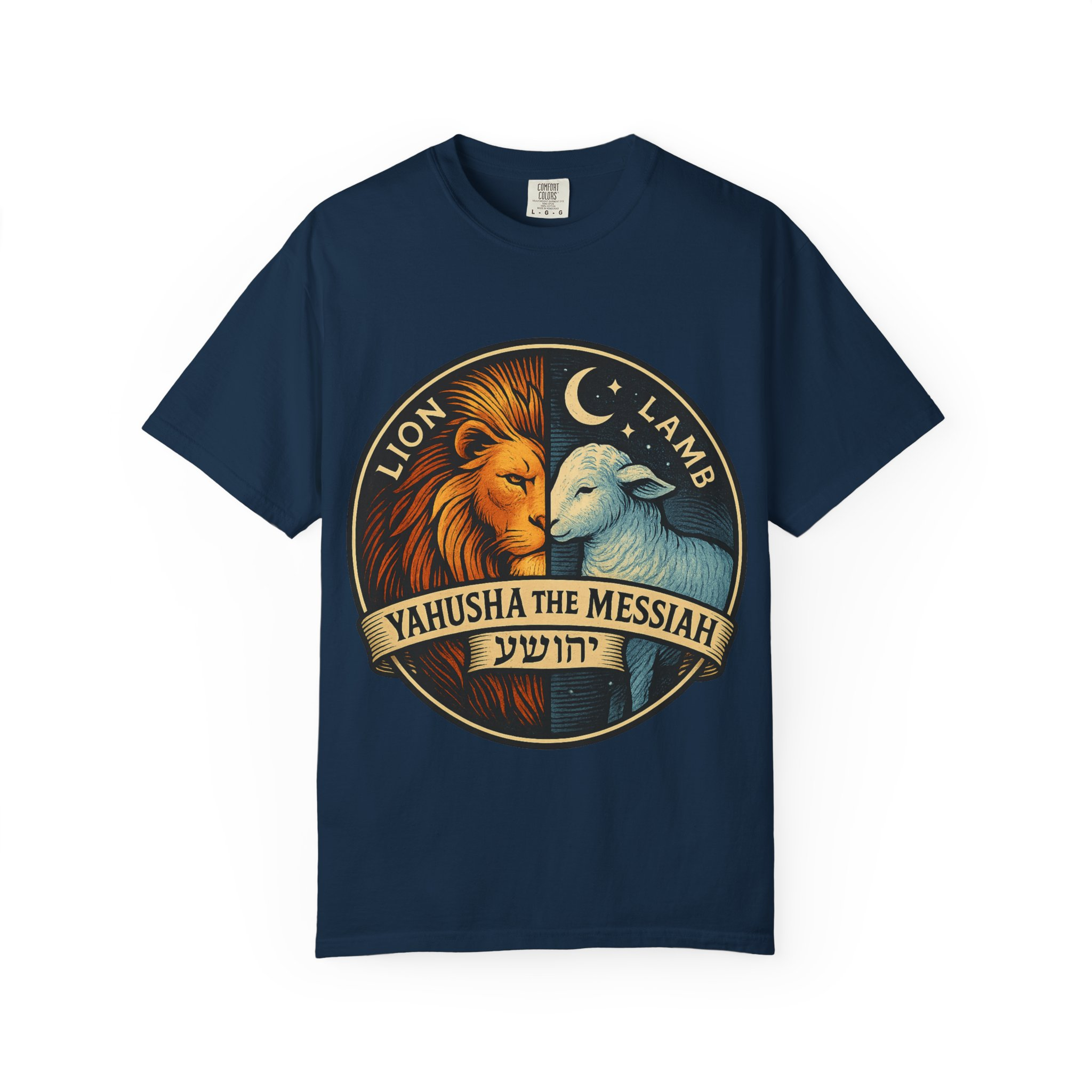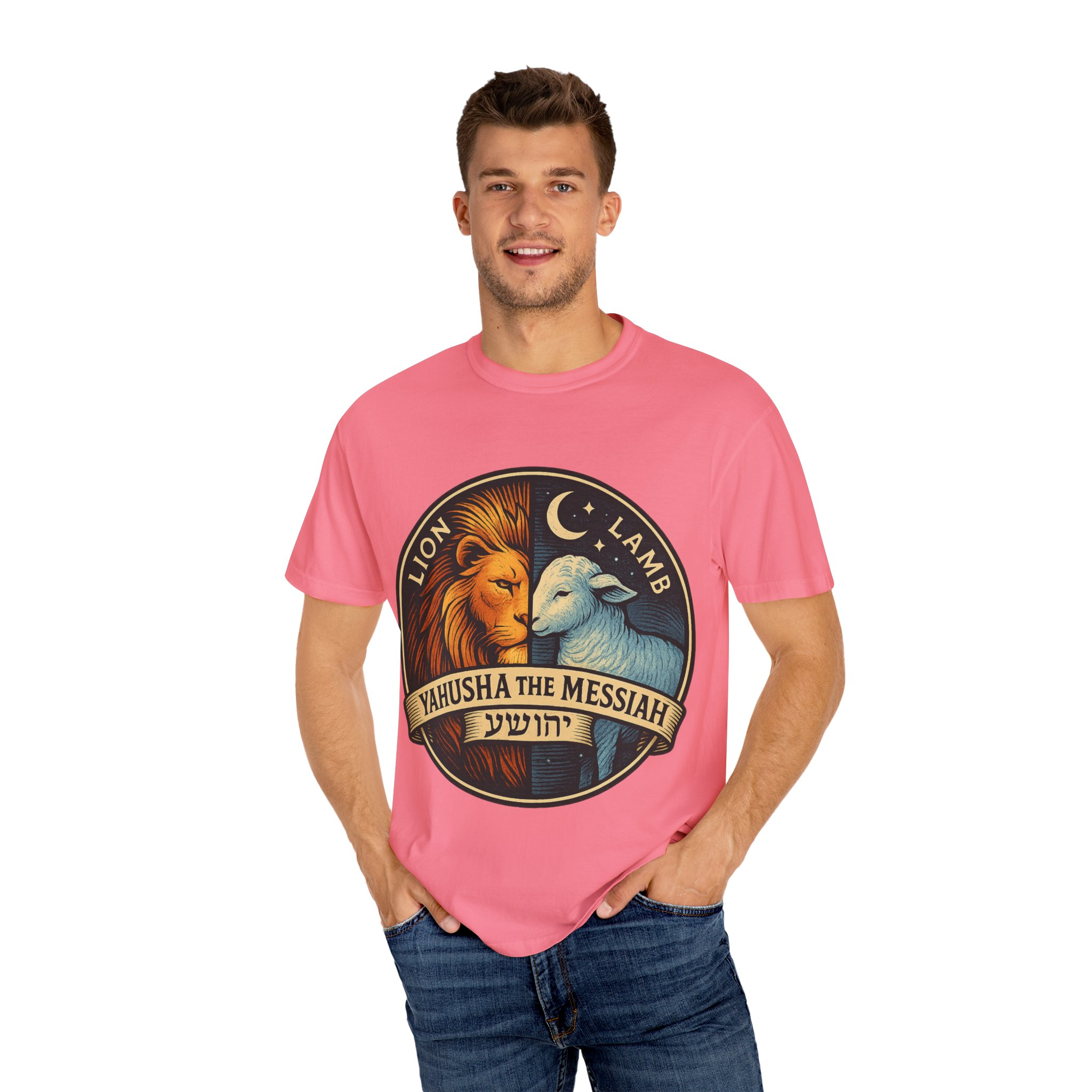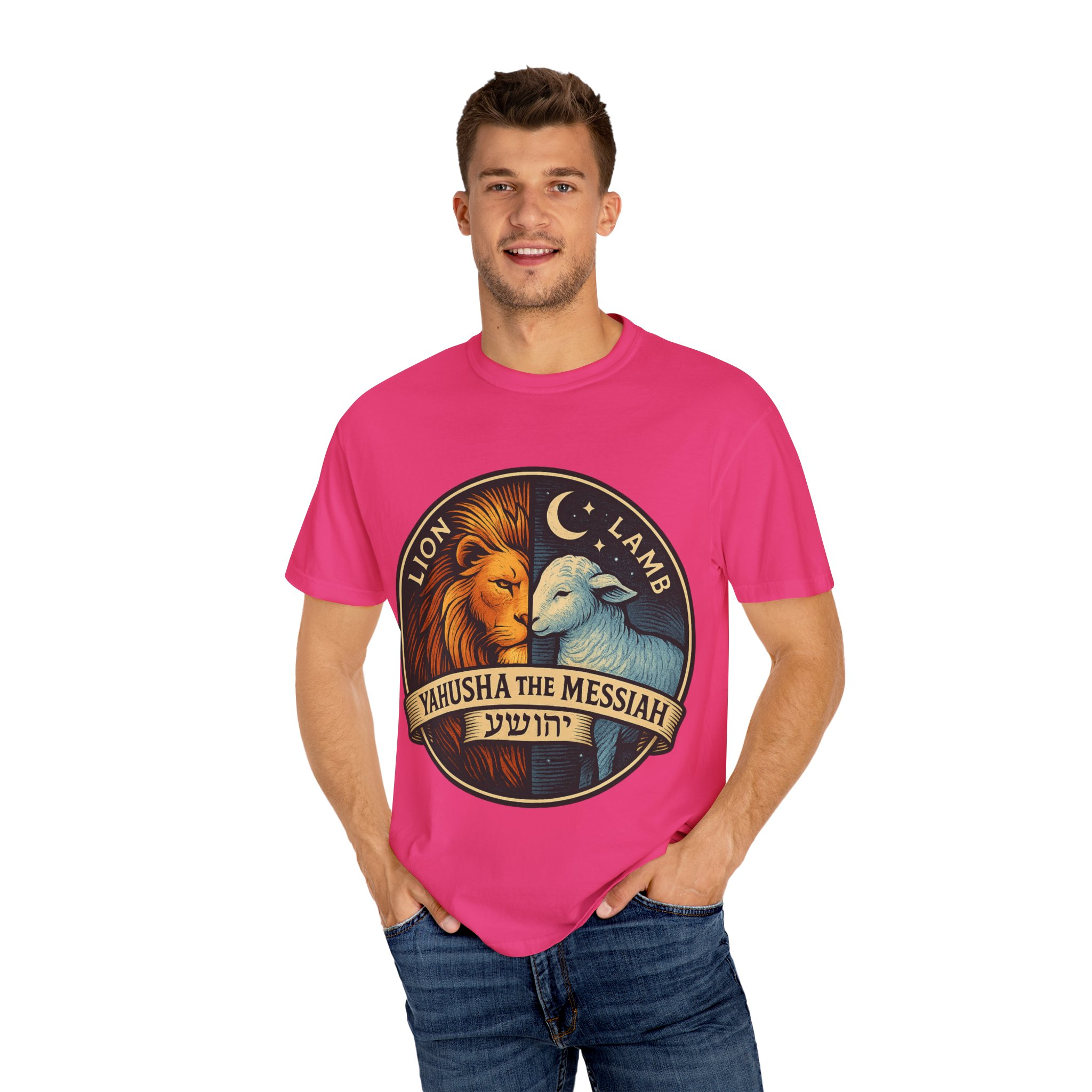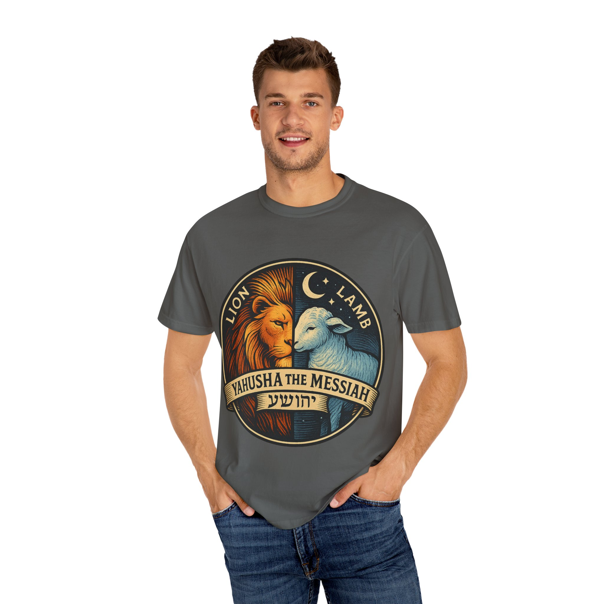 This bold emblem captures the dual nature of Yahusha the Messiah—the conquering Lion and the gentle Lamb. The circular design is split vertically: one side features a regal lion with a blazing sunburst mane, while the other shows a peaceful lamb under a serene night sky. In the center, a banner reads “Yahusha the Messiah”, with the sacred Hebrew name יהושע beneath. Fiery oranges and cool blues create a dramatic contrast symbolizing justice and mercy, strength and humility. A perfect design for believers who walk in both truth and grace. Embrace comfort and style with this unisex garment-dyed t-shirt. Crafted for both casual and semi-formal settings, it features a relaxed fit that suits various body types and a classic crew neckline perfect for layering or accessorizing. This versatile tee evokes a laid-back atmosphere, making it ideal for everyday wear or special occasions. Celebrate your faith and express your individuality, whether it’s for a gathering, a holiday celebration, or just a cozy day at home. Perfect for anyone who values comfort and authenticity in their clothing choices, it’s a thoughtful gift for friends and family during holidays like Christmas or Easter, or as a personal treat for yourself.