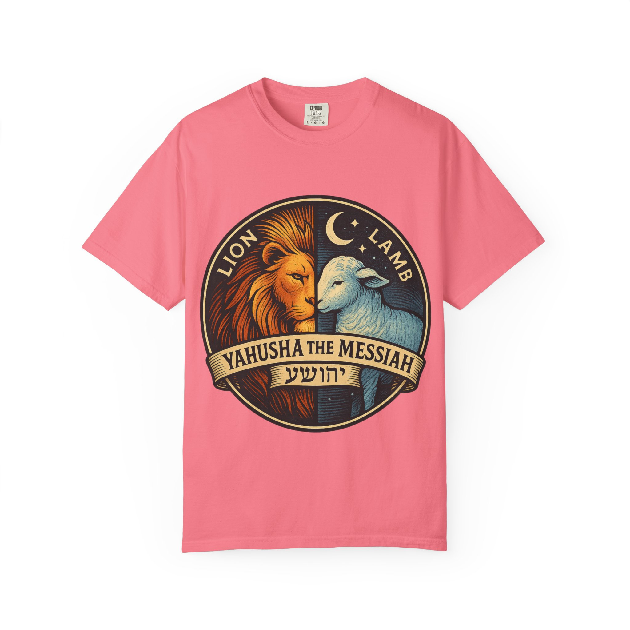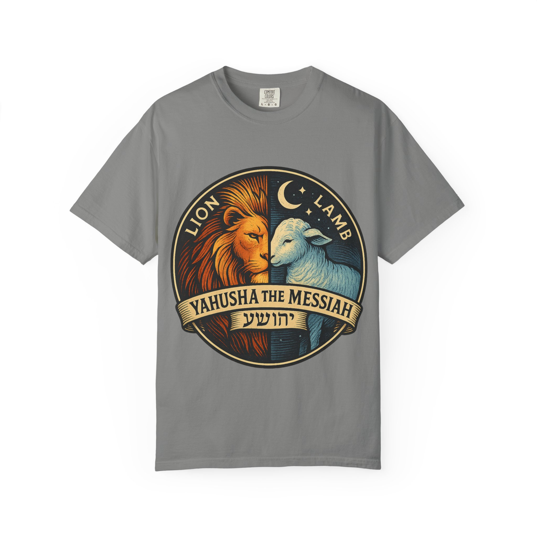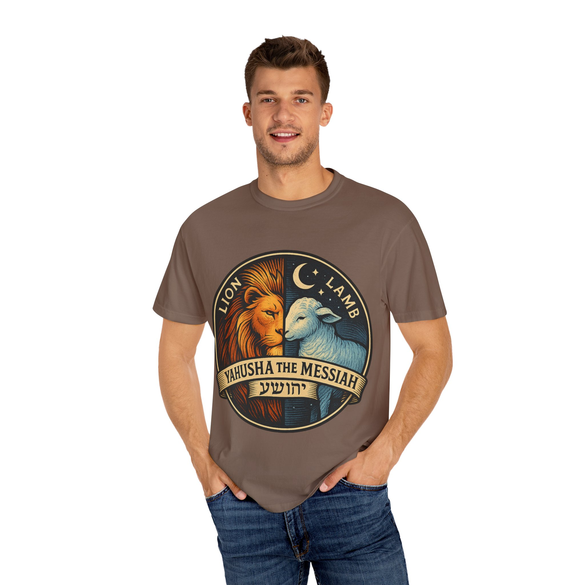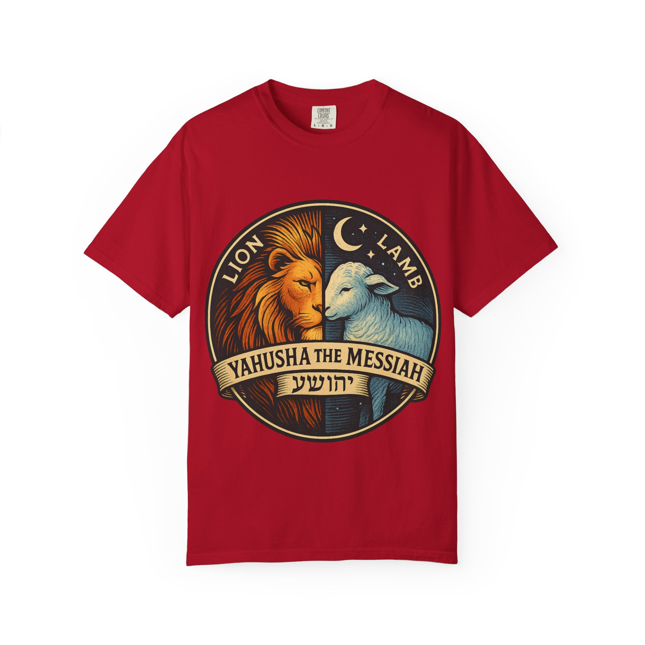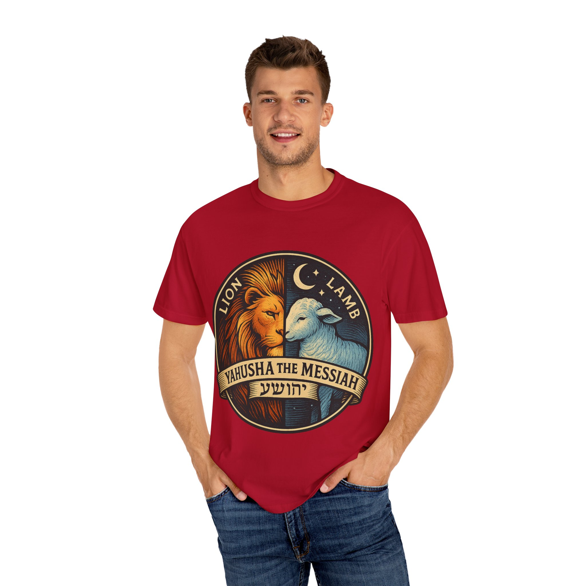 This bold emblem captures the dual nature of Yahusha the Messiah—the conquering Lion and the gentle Lamb. The circular design is split vertically: one side features a regal lion with a blazing sunburst mane, while the other shows a peaceful lamb under a serene night sky. In the center, a banner reads “Yahusha the Messiah”, with the sacred Hebrew name יהושע beneath. Fiery oranges and cool blues create a dramatic contrast symbolizing justice and mercy, strength and humility. A perfect design for believers who walk in both truth and grace. Embrace comfort and style with this unisex garment-dyed t-shirt. Crafted for both casual and semi-formal settings, it features a relaxed fit that suits various body types and a classic crew neckline perfect for layering or accessorizing. This versatile tee evokes a laid-back atmosphere, making it ideal for everyday wear or special occasions. Celebrate your faith and express your individuality, whether it’s for a gathering, a holiday celebration, or just a cozy day at home. Perfect for anyone who values comfort and authenticity in their clothing choices, it’s a thoughtful gift for friends and family during holidays like Christmas or Easter, or as a personal treat for yourself.