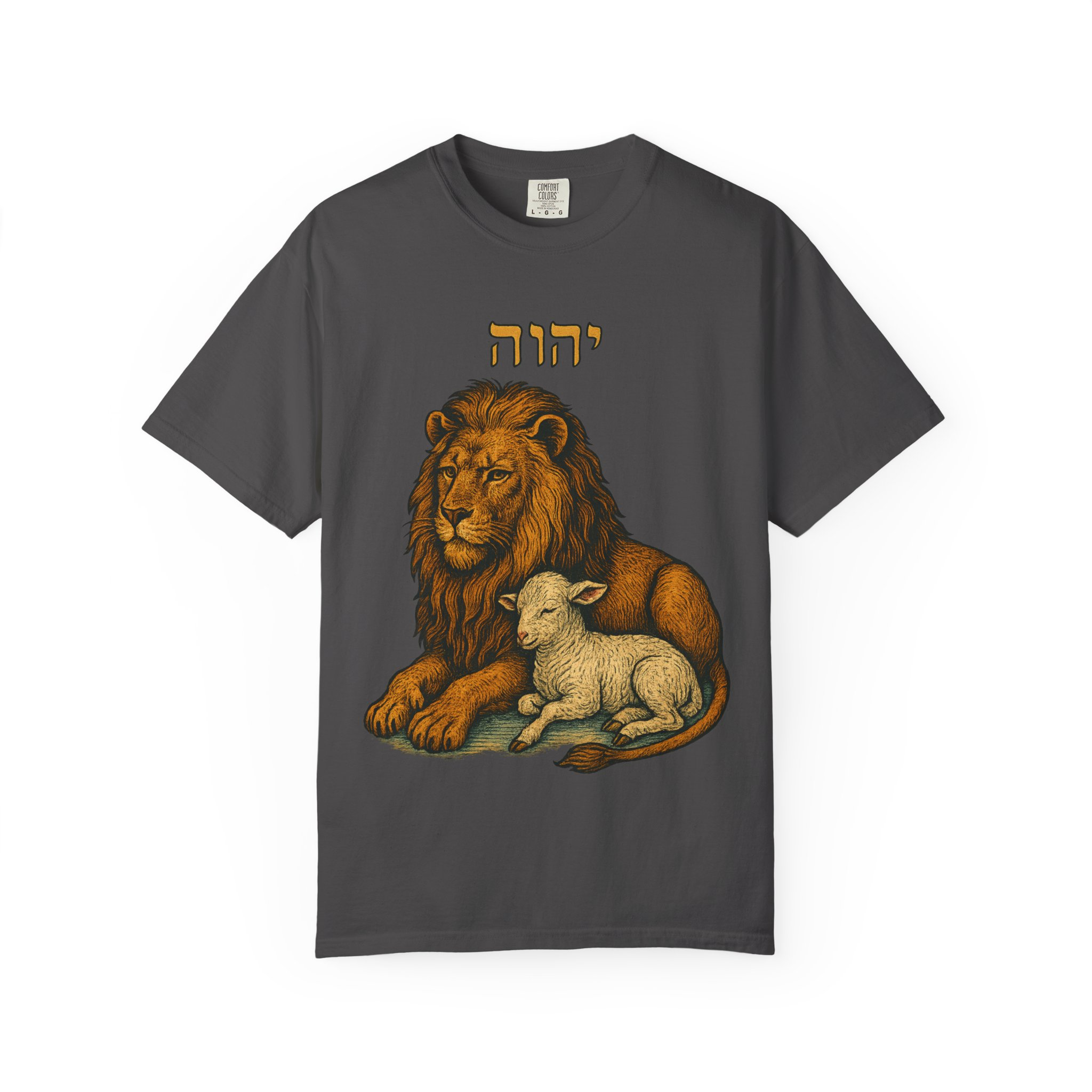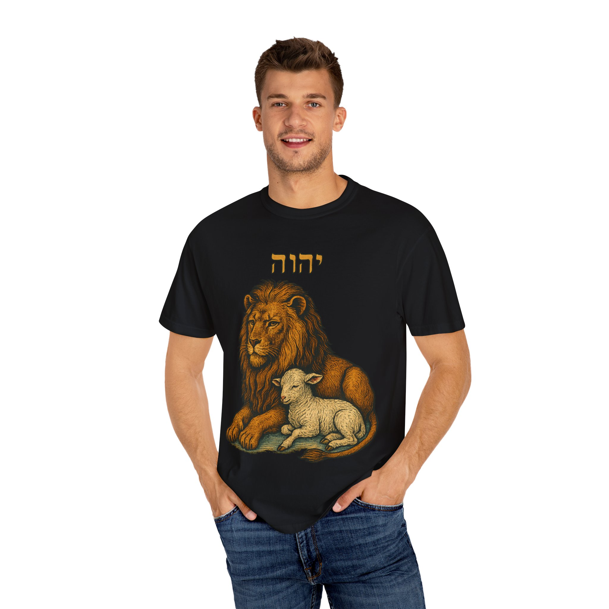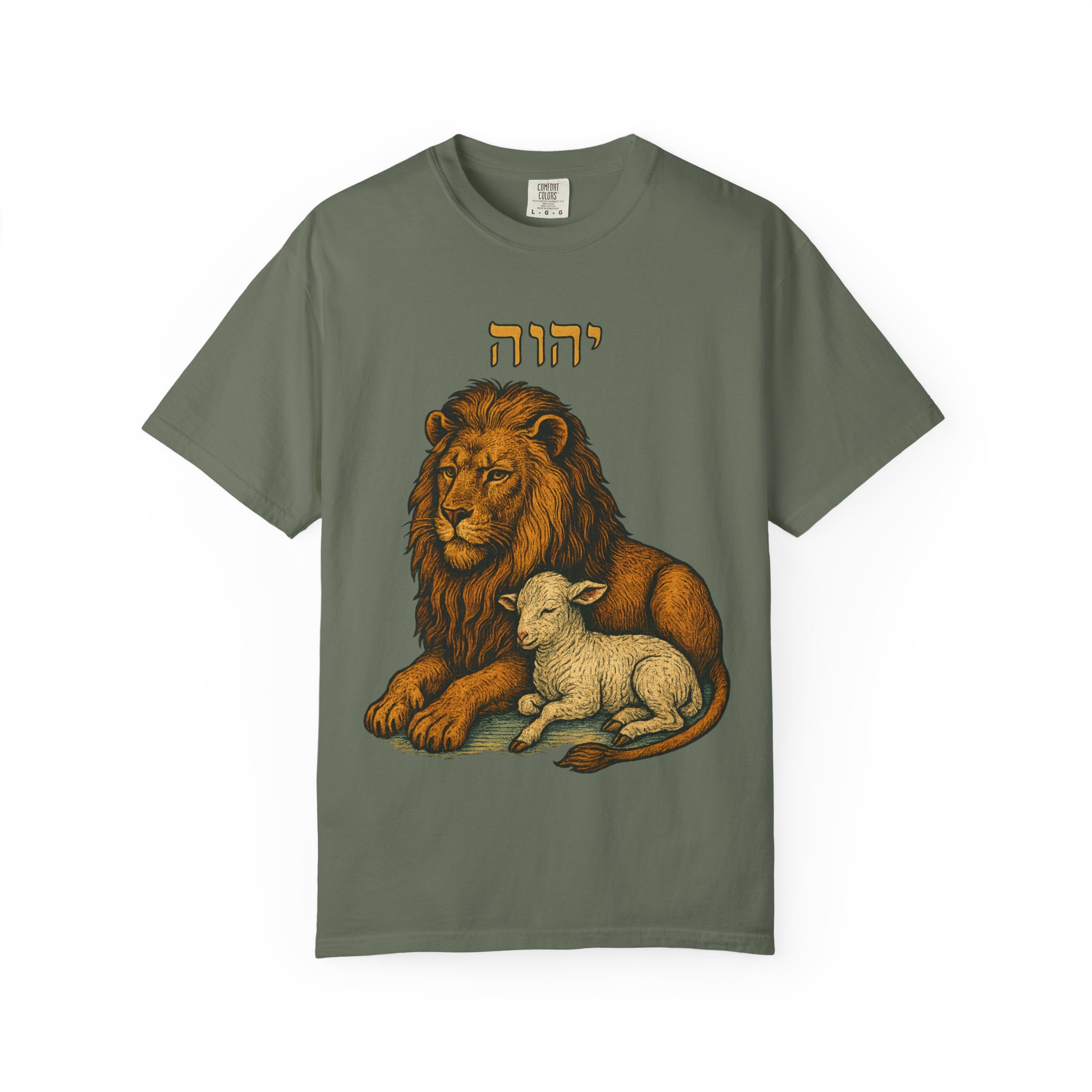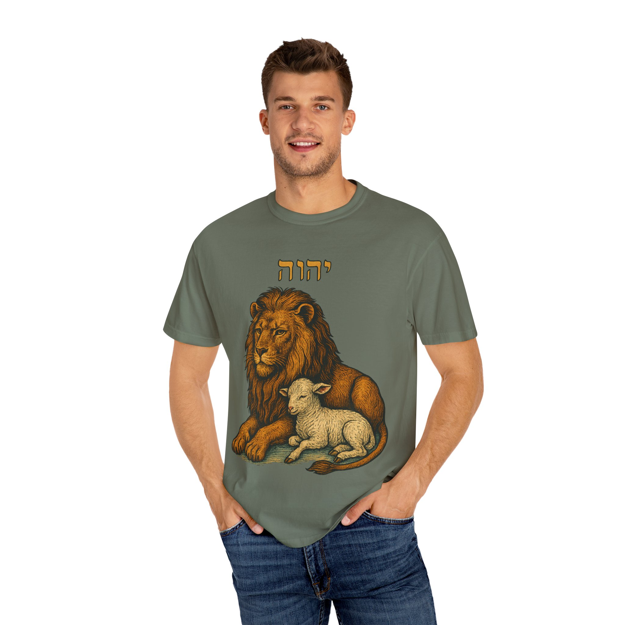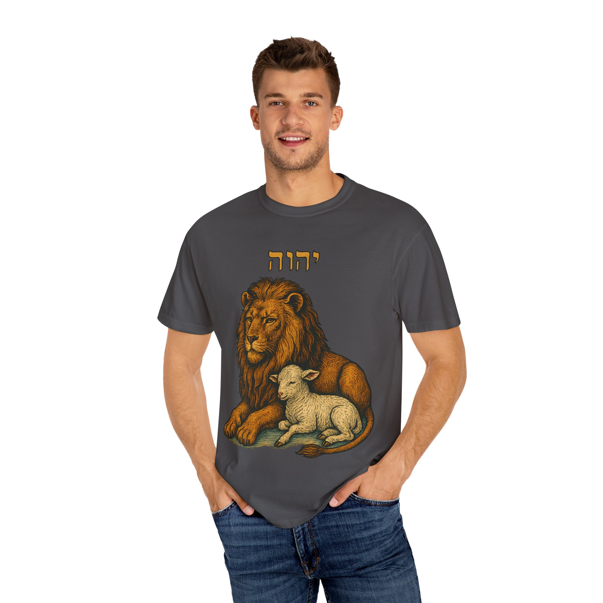 Lion and Lamb YHWH Prophetic Tee T-shirt – Unisex Garment-Dyed Tee for Nature Lovers, Spiritual Gifts, Animal Lovers, Cozy Shirt