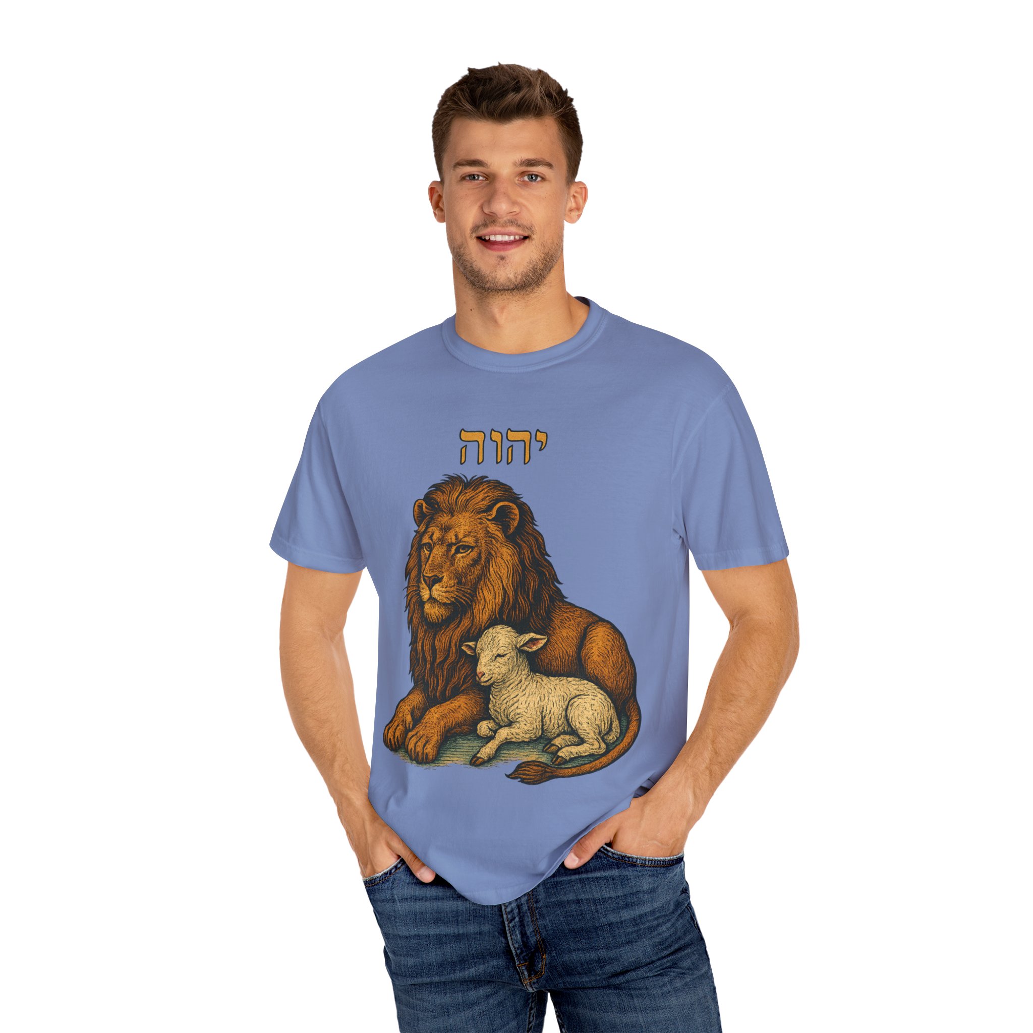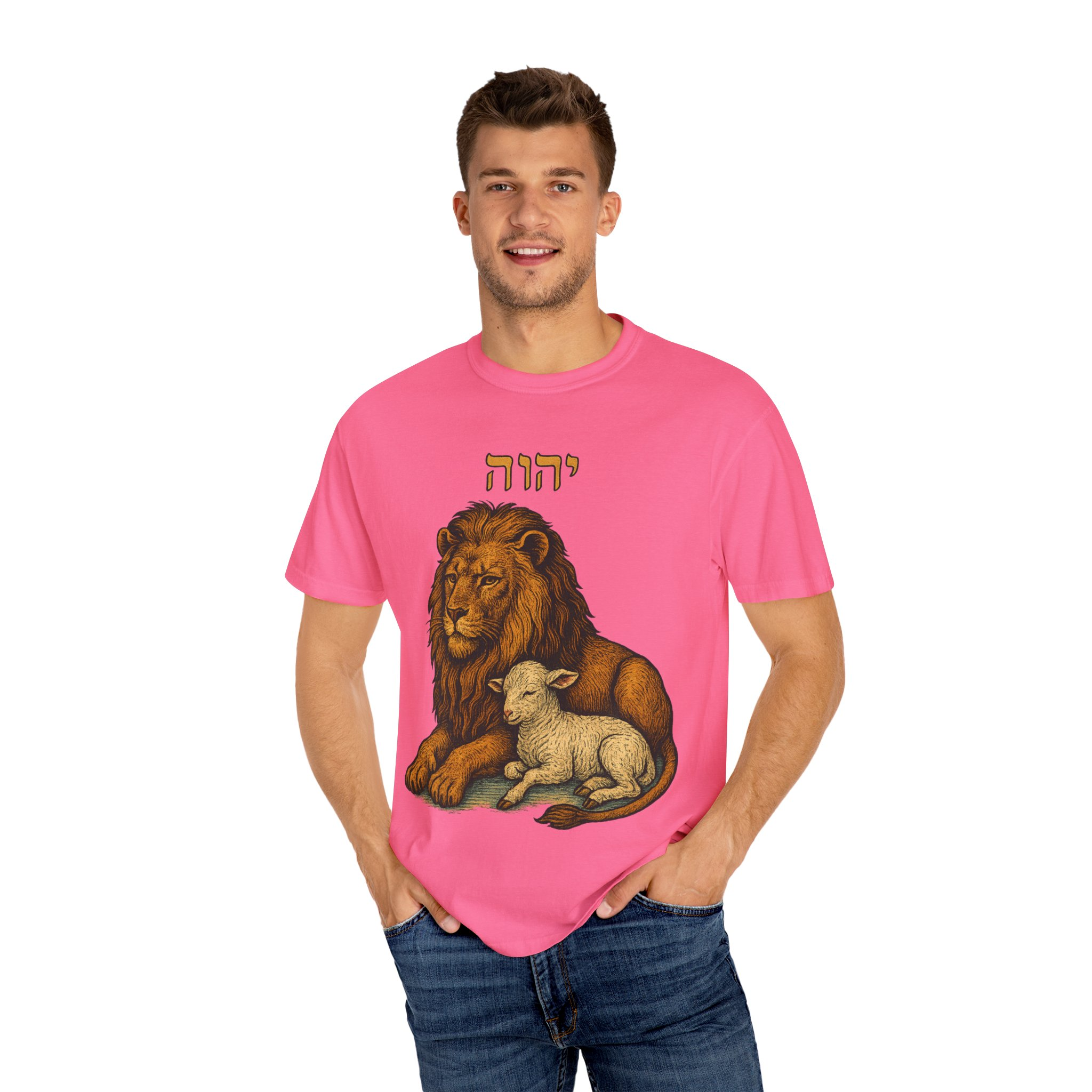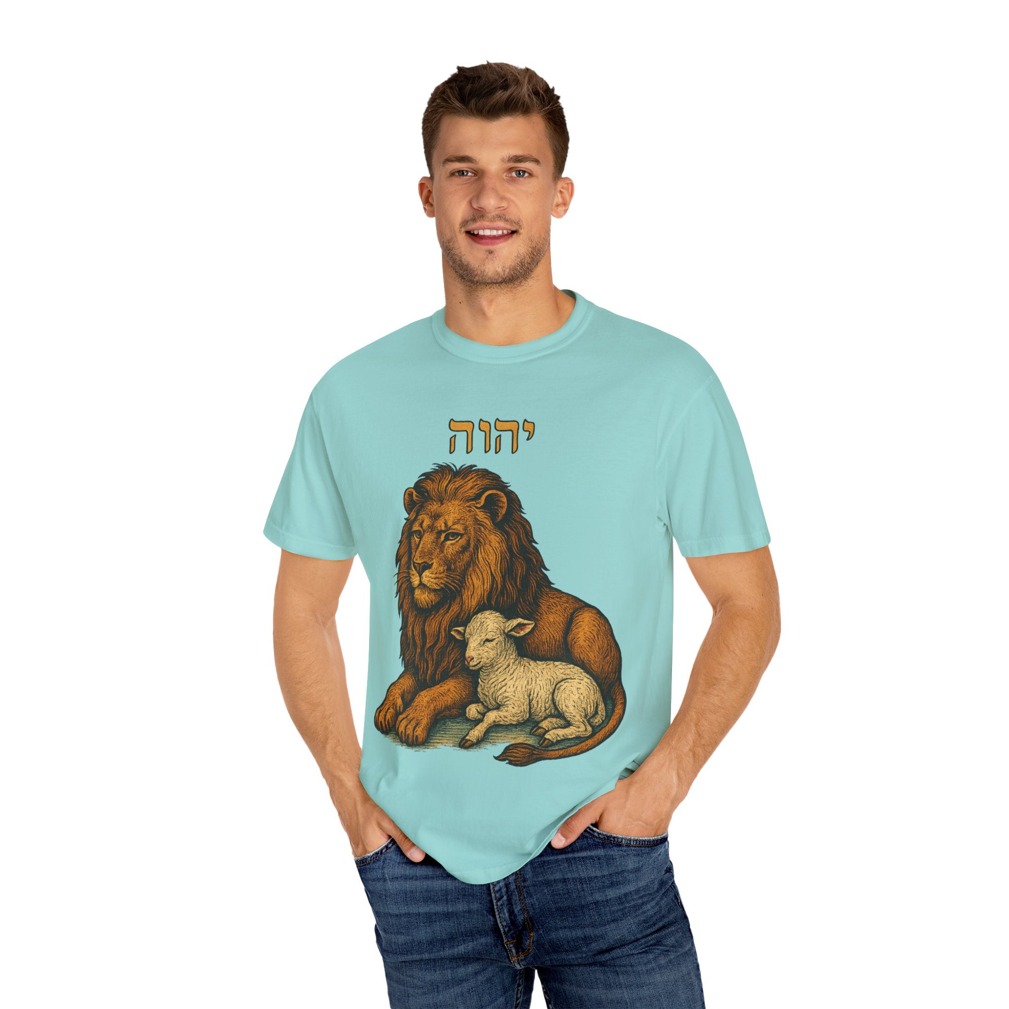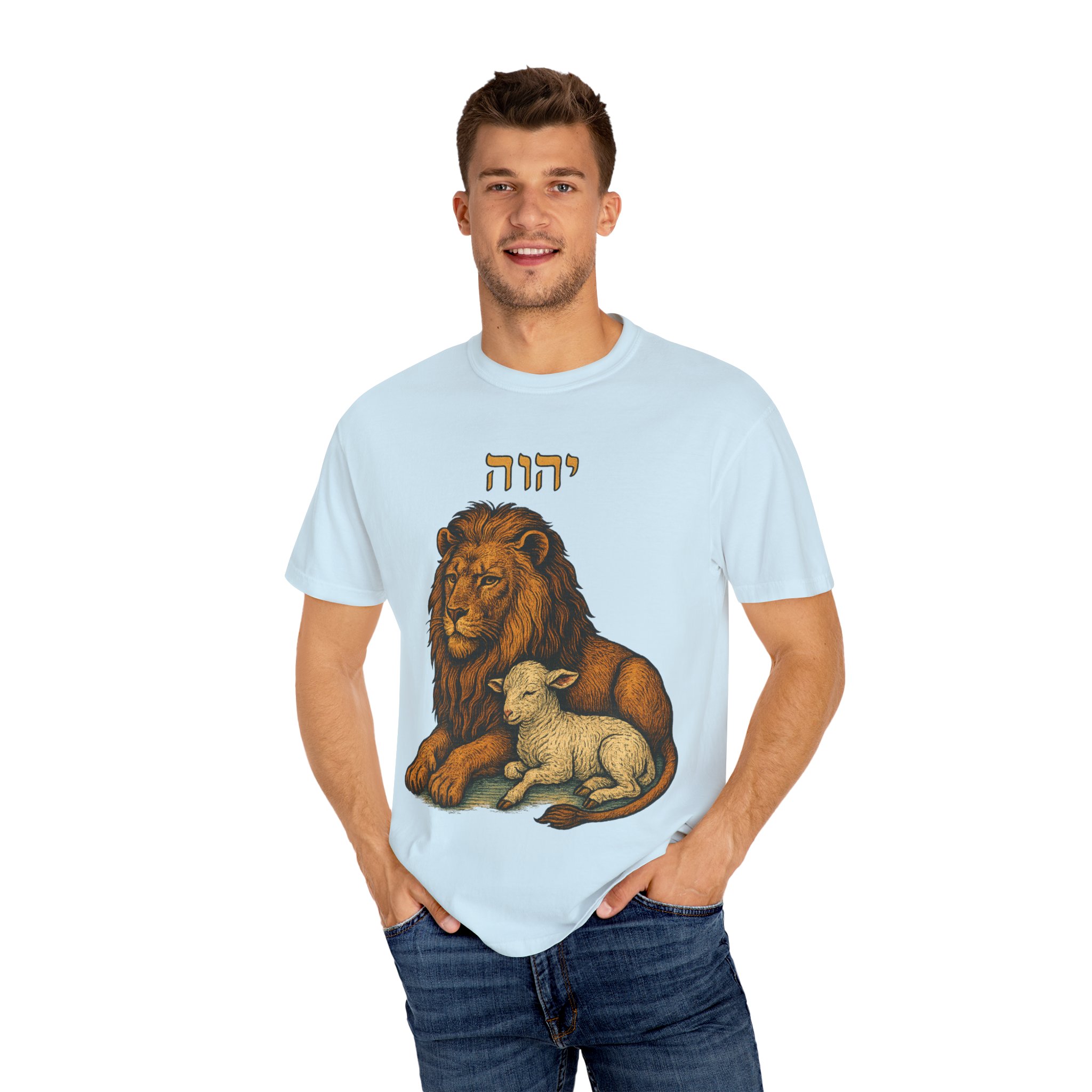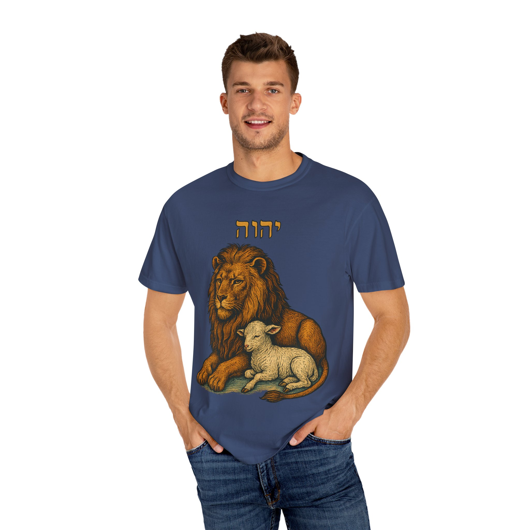 Lion and Lamb YHWH Prophetic Tee T-shirt – Unisex Garment-Dyed Tee for Nature Lovers, Spiritual Gifts, Animal Lovers, Cozy Shirt