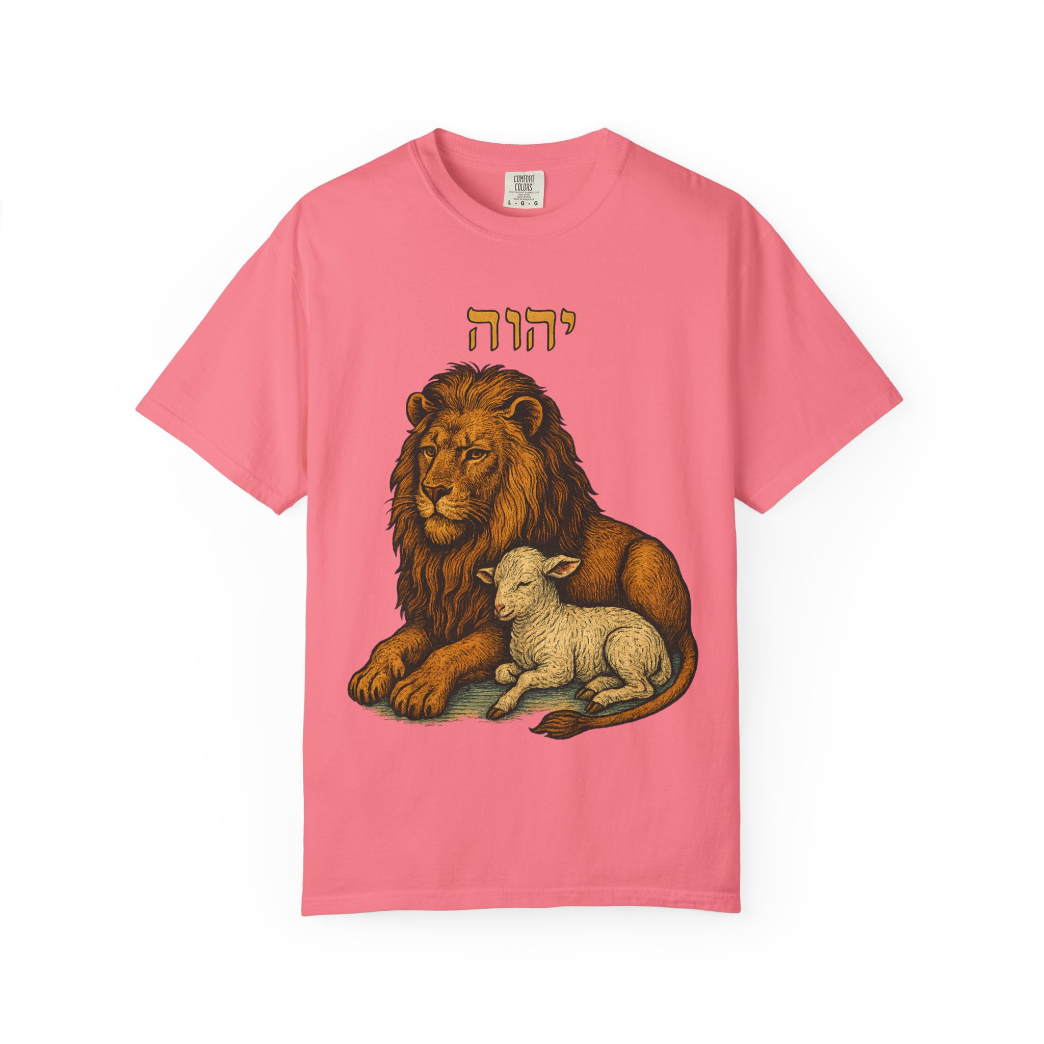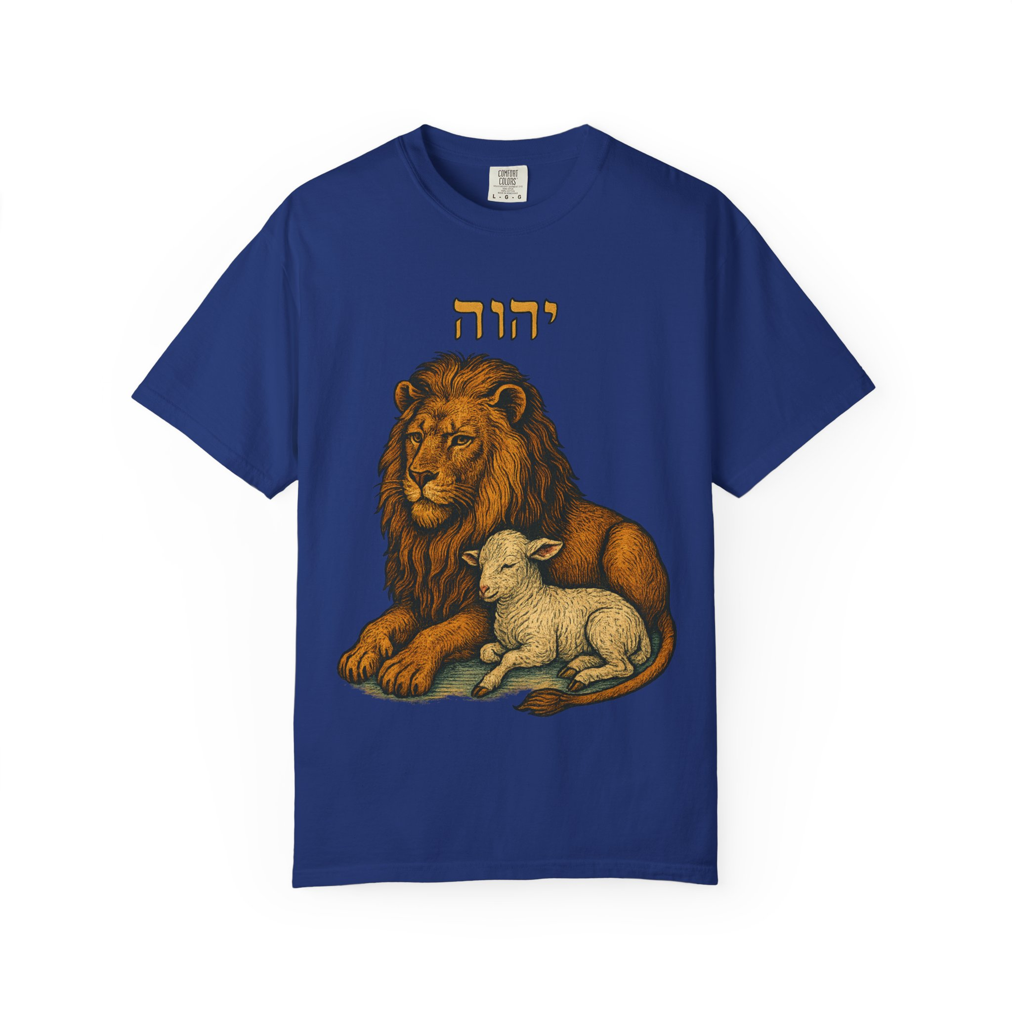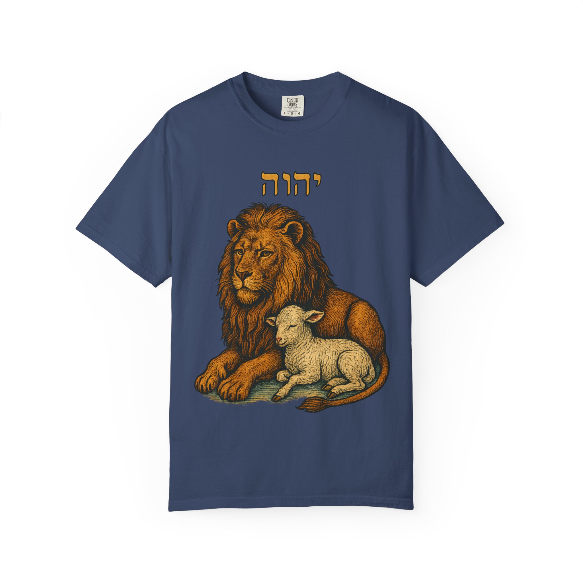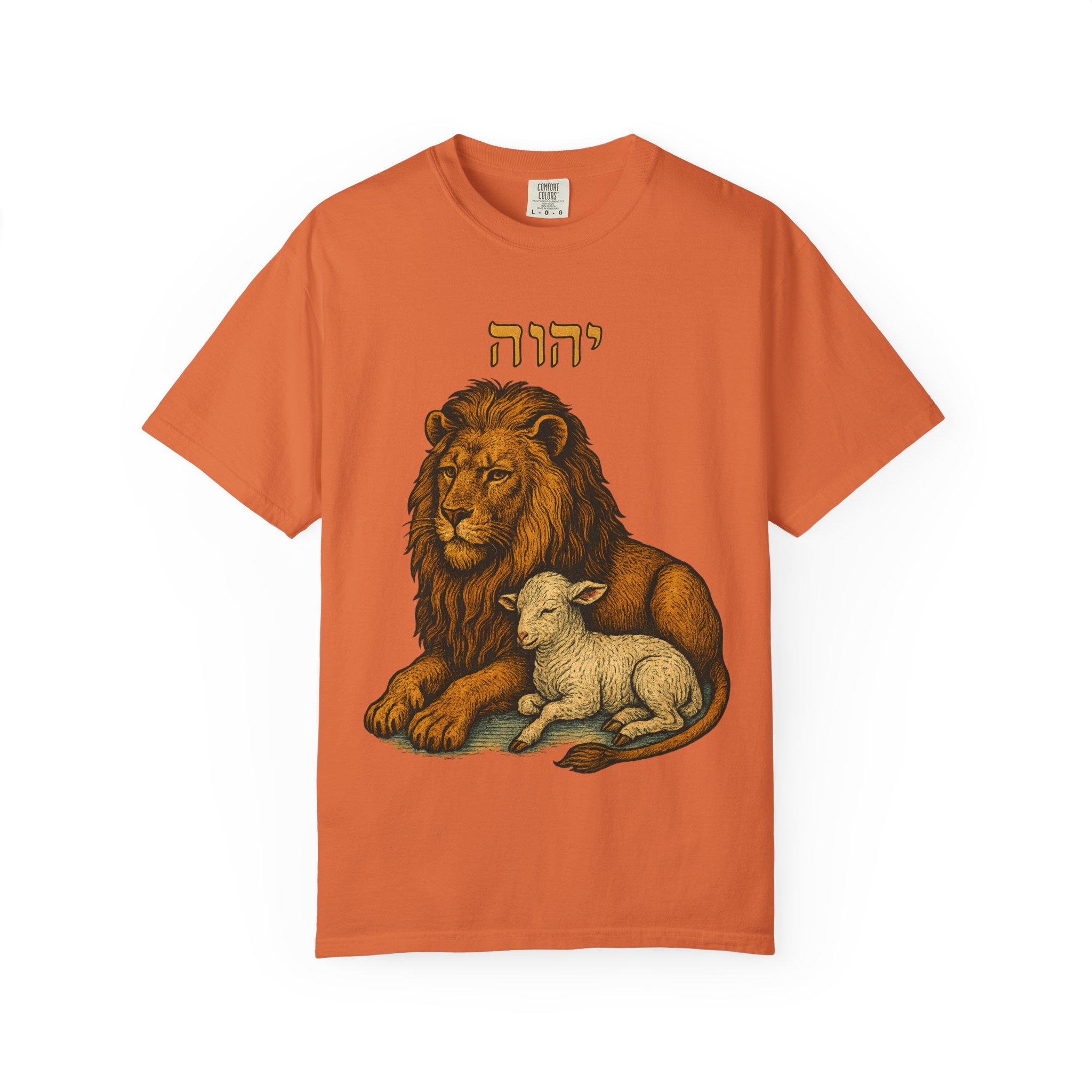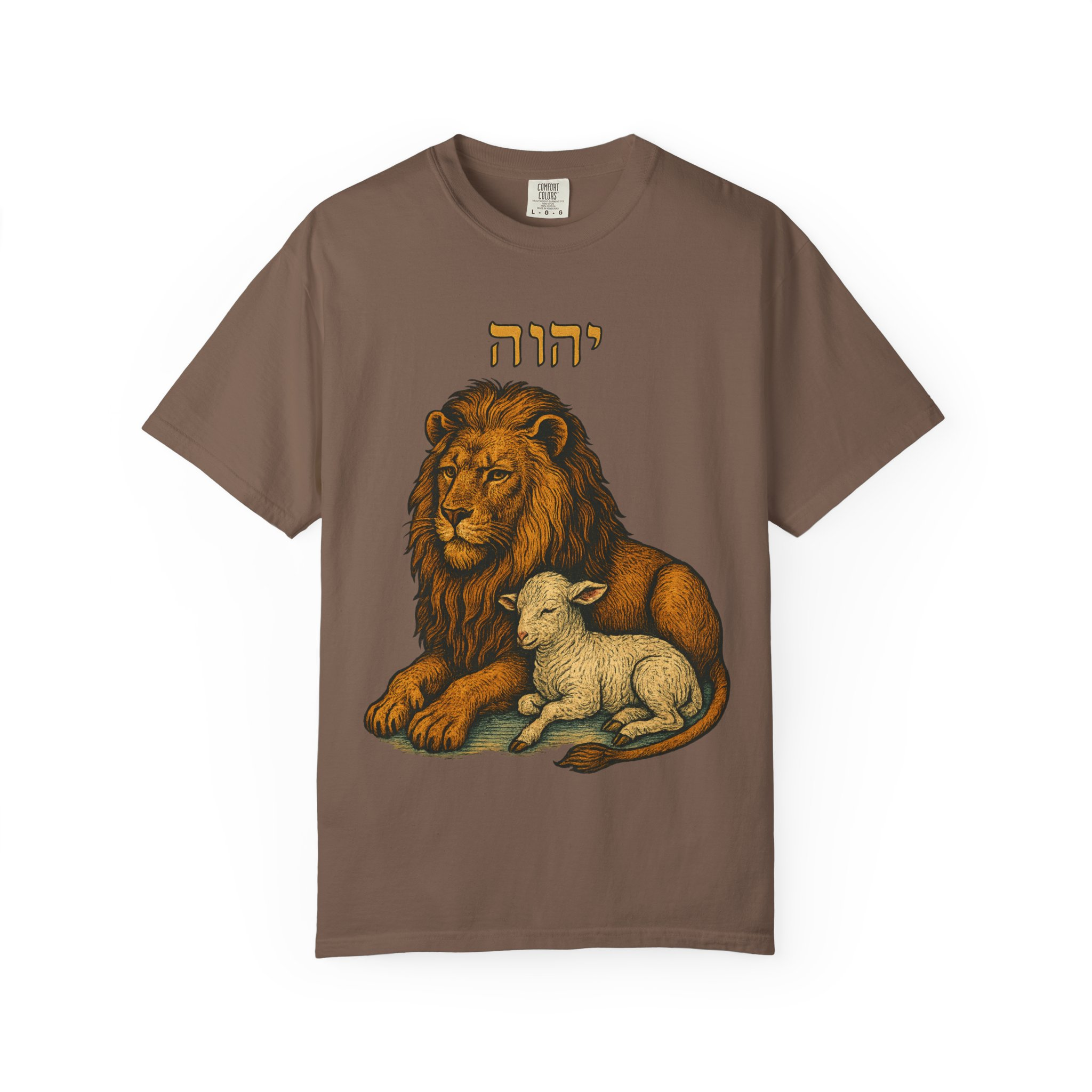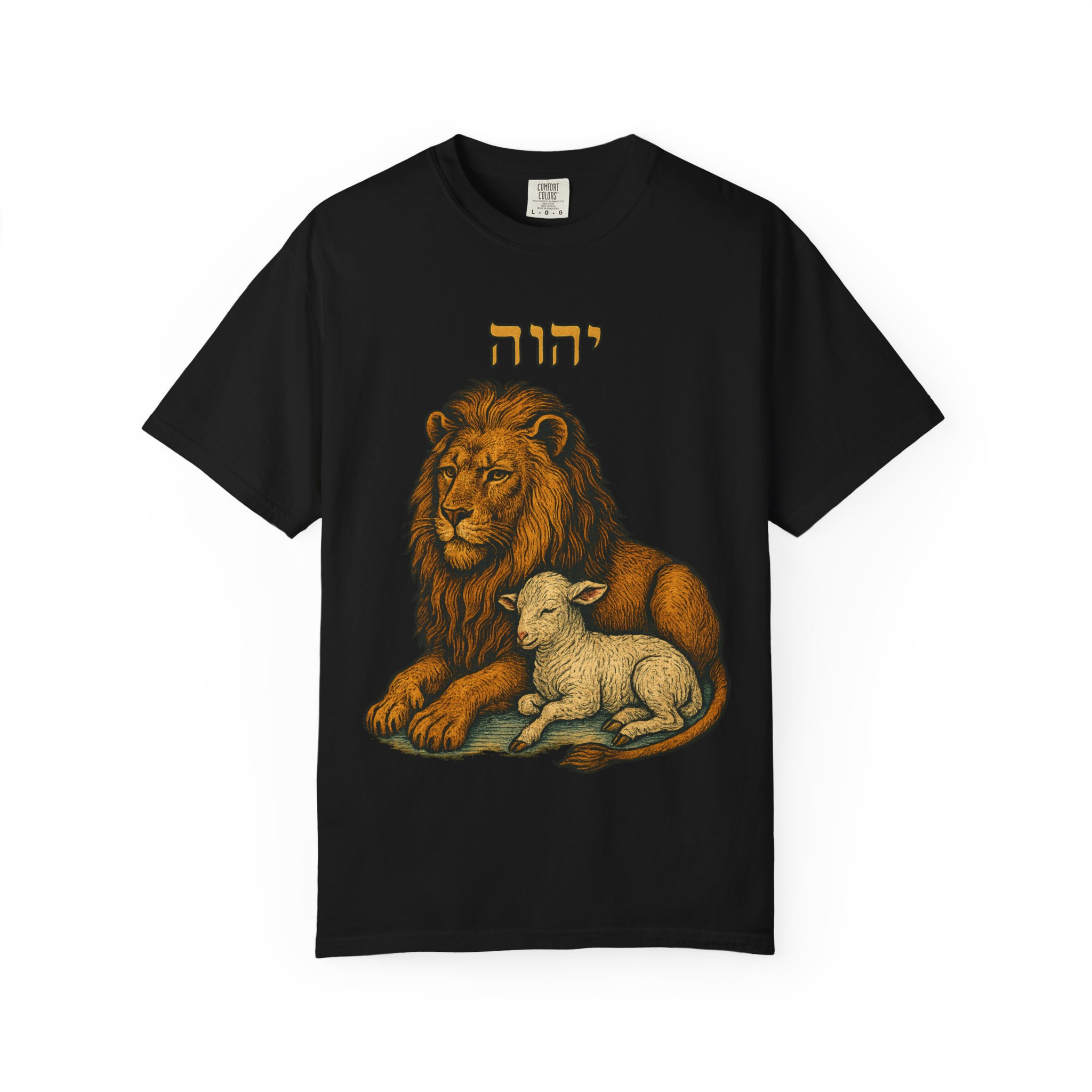 Lion and Lamb YHWH Prophetic Tee T-shirt – Unisex Garment-Dyed Tee for Nature Lovers, Spiritual Gifts, Animal Lovers, Cozy Shirt