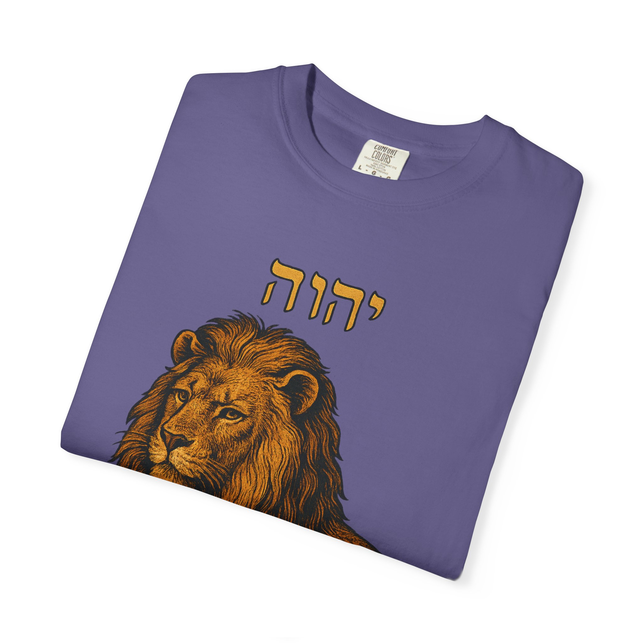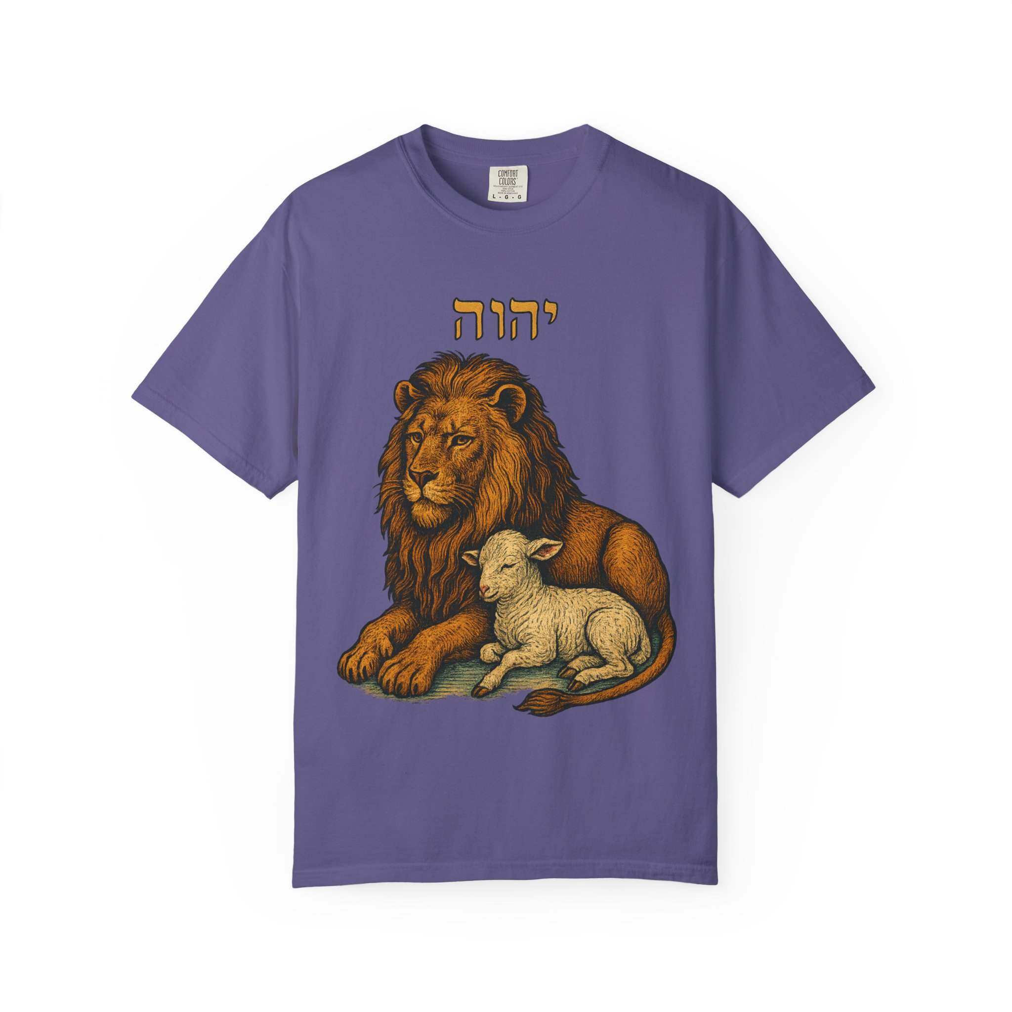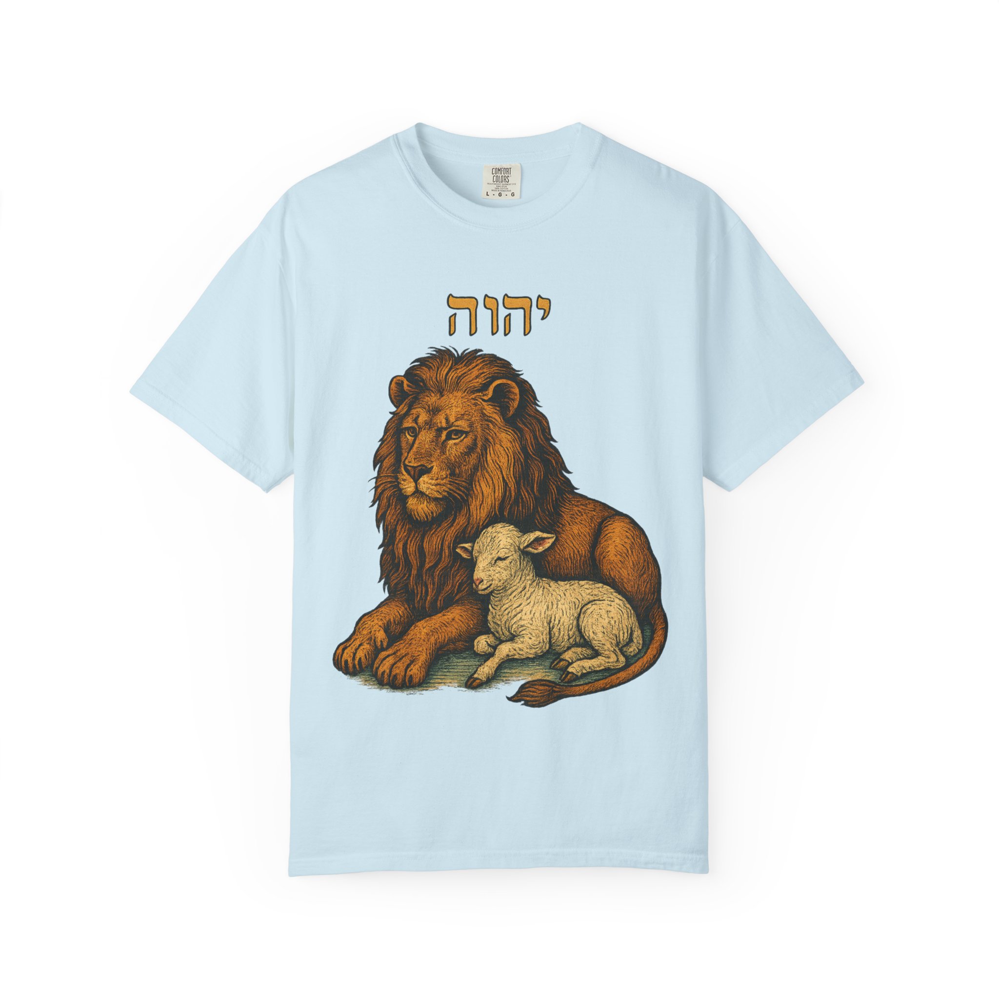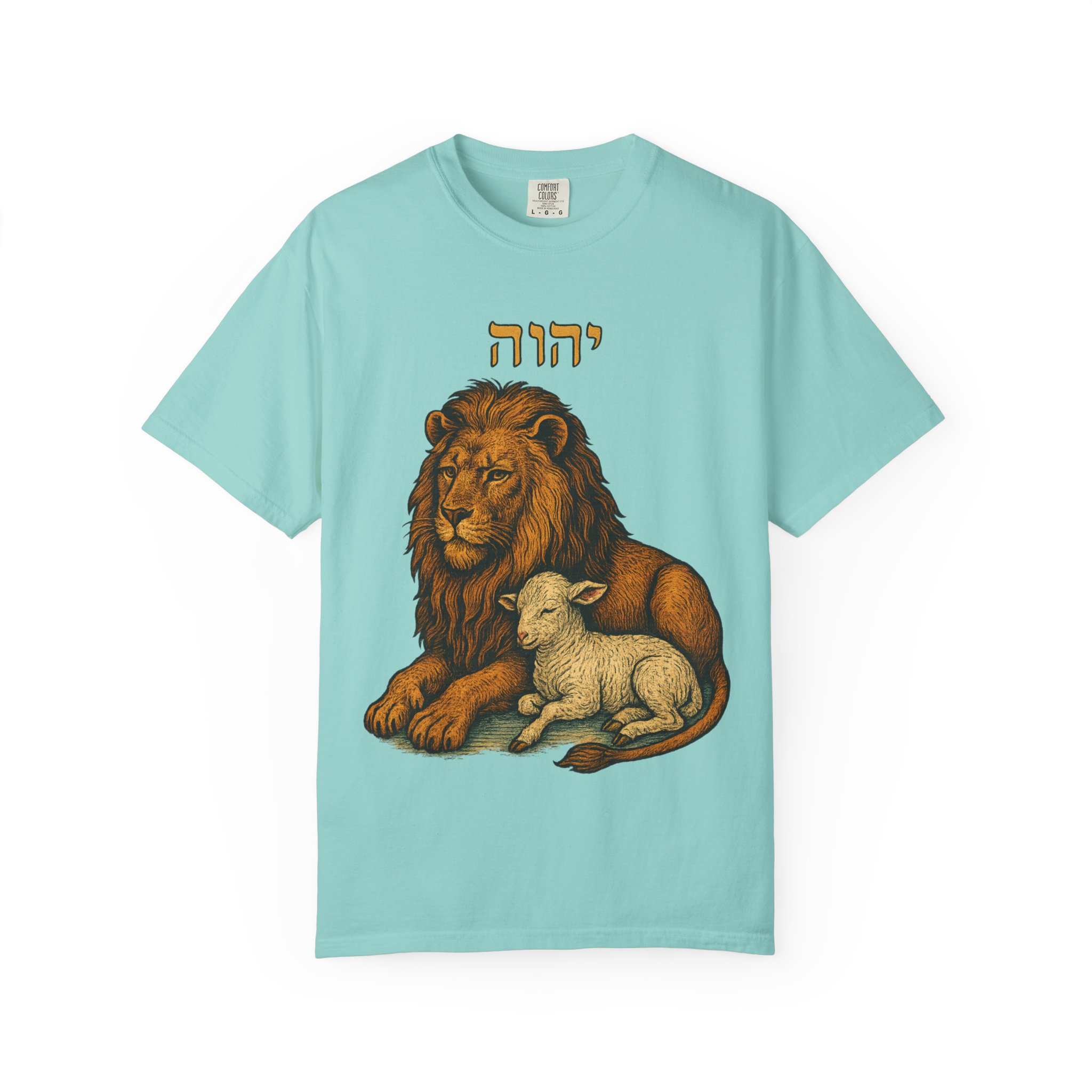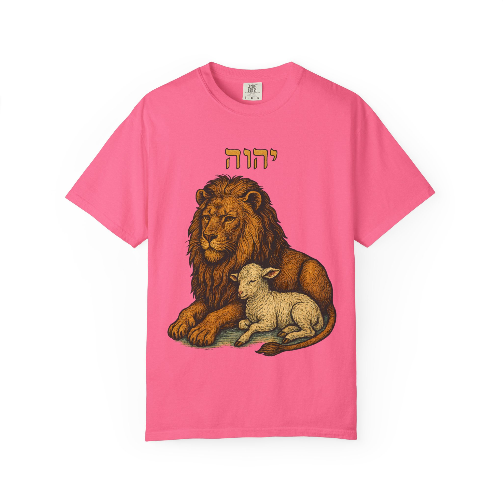 Lion and Lamb YHWH Prophetic Tee T-shirt – Unisex Garment-Dyed Tee for Nature Lovers, Spiritual Gifts, Animal Lovers, Cozy Shirt